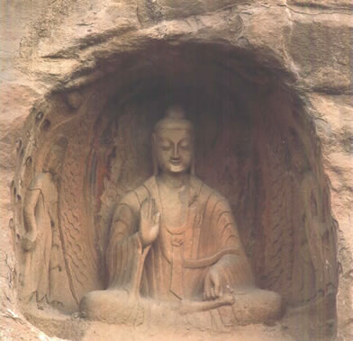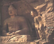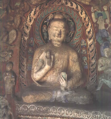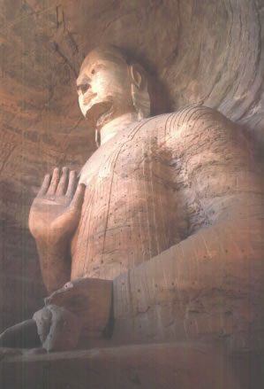 早期石窟:即今第16~20窟,亦稱(chēng)為曇曜五窟。根據(jù)《魏書(shū)·釋老志》(卷114)記載:“和平初,師賢卒。曇耀代之,更名沙門(mén)統(tǒng)。初,曇耀于復(fù)法之明年,自中山被命赴京,值帝出,見(jiàn)于路,御馬前銜耀衣,時(shí)人以為馬識(shí)善人,帝后奉以師禮。曇曜白帝,於京城西武州塞,鑿山石壁,開(kāi)窟五所,鐫建佛像各一,高者七十尺,次六十尺,雕飾奇?zhèn),冠于一世。”文中記述的開(kāi)窟五所,就是當(dāng)時(shí)著名的高僧曇曜就選擇了鐘靈毓秀的武州山,開(kāi)鑿了雄偉壯觀的曇曜五窟,揭開(kāi)了云岡石窟開(kāi)鑿的序幕。第16~20窟即帝王象征的曇曜五窟,以造像的風(fēng)格和創(chuàng)作的技法來(lái)看,是云岡全窟群中最早的五個(gè)窟。平面為馬蹄形,穹隆頂,外壁滿(mǎn)雕千佛。主要造像為三世佛(過(guò)去、現(xiàn)在、未來(lái)),佛像高大,面相豐圓,高鼻深目,雙肩齊挺,顯示出一種勁健、渾厚、質(zhì)樸的造像作風(fēng)。其雕刻技藝?yán)^承并發(fā)展了漢代的優(yōu)秀傳統(tǒng),吸收并融合了古印度犍陀羅、秣菟羅藝術(shù)的精華,創(chuàng)造出具有獨(dú)特的藝術(shù)風(fēng)格,這是中外融合所形成的新的藝術(shù)風(fēng)格。