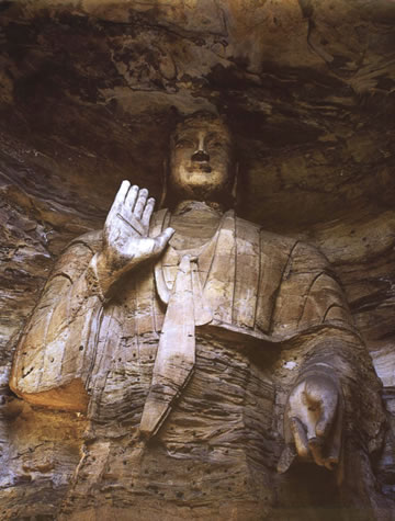 露天大佛高約13.7米,端坐于石臺(tái)座之上。佛首磨光肉髻,方圓面相,廣額豐頤,眉眼細(xì)長(zhǎng),鼻梁挺直,大耳垂肩;眉間施白毫,嘴唇略薄,唇上、下巴有八字胡須。眼中瞳孔為琉璃鑲嵌,大約是在遼代安裝。佛身挺拔壯碩,兩肩寬厚,著袒右肩式袈裟。袈裟質(zhì)地厚重,衣褶自然流暢,具有犍陀羅造像遺風(fēng)。大佛內(nèi)衣輕薄貼體,整體疏密得當(dāng),雕刻工藝精湛。大佛神情莊嚴(yán),慈祥泰然,結(jié)跏趺坐,雙手于腹間相會(huì)疊加,呈禪定手印。可惜手部與雙腿風(fēng)雨侵蝕,雕飾全無(wú)。但是大佛姿態(tài)雄偉,氣宇軒昂,生氣勃勃,融合東西方雕塑藝術(shù)于一體,是兼?zhèn)淞朔鹜印叭、八十種隨形好”的造像珍品。