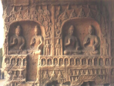 拱門(mén)高3.1米,寬2.25米。外側(cè)雕刻尖形門(mén)楣,內(nèi)飾忍冬紋。門(mén)外西側(cè)崩塌,經(jīng)近期修補(bǔ),東側(cè)現(xiàn)存一力士,風(fēng)化嚴(yán)重。拱門(mén)西壁下部風(fēng)化嚴(yán)重。中部北側(cè)雕一圓拱龕,內(nèi)為坐佛。龕外兩側(cè)各雕一脅侍菩薩。龕楣內(nèi)雕七佛,龕兩側(cè)各雕五重千佛龕。中部南側(cè)雕一方形龕,內(nèi)為坐佛,龕外兩側(cè)各雕一脅侍菩薩。上層為方形帷幕龕,西壁雕坐佛坐于蓮座之上,兩側(cè)各雕一脅侍菩薩,南、北兩壁各雕一立佛,下雕蓮座。拱門(mén)東壁中、下部雕零散小龕,風(fēng)化嚴(yán)重。上部北側(cè)雕三層佛塔一座,塔下雕一圓拱龕,內(nèi)為坐佛。南側(cè)雕一盝形帷幕龕,內(nèi)為交腳菩薩,龕南側(cè)崩塌,F(xiàn)存北側(cè)一思惟菩薩與飛天。龕楣方格內(nèi)雕坐佛。 |