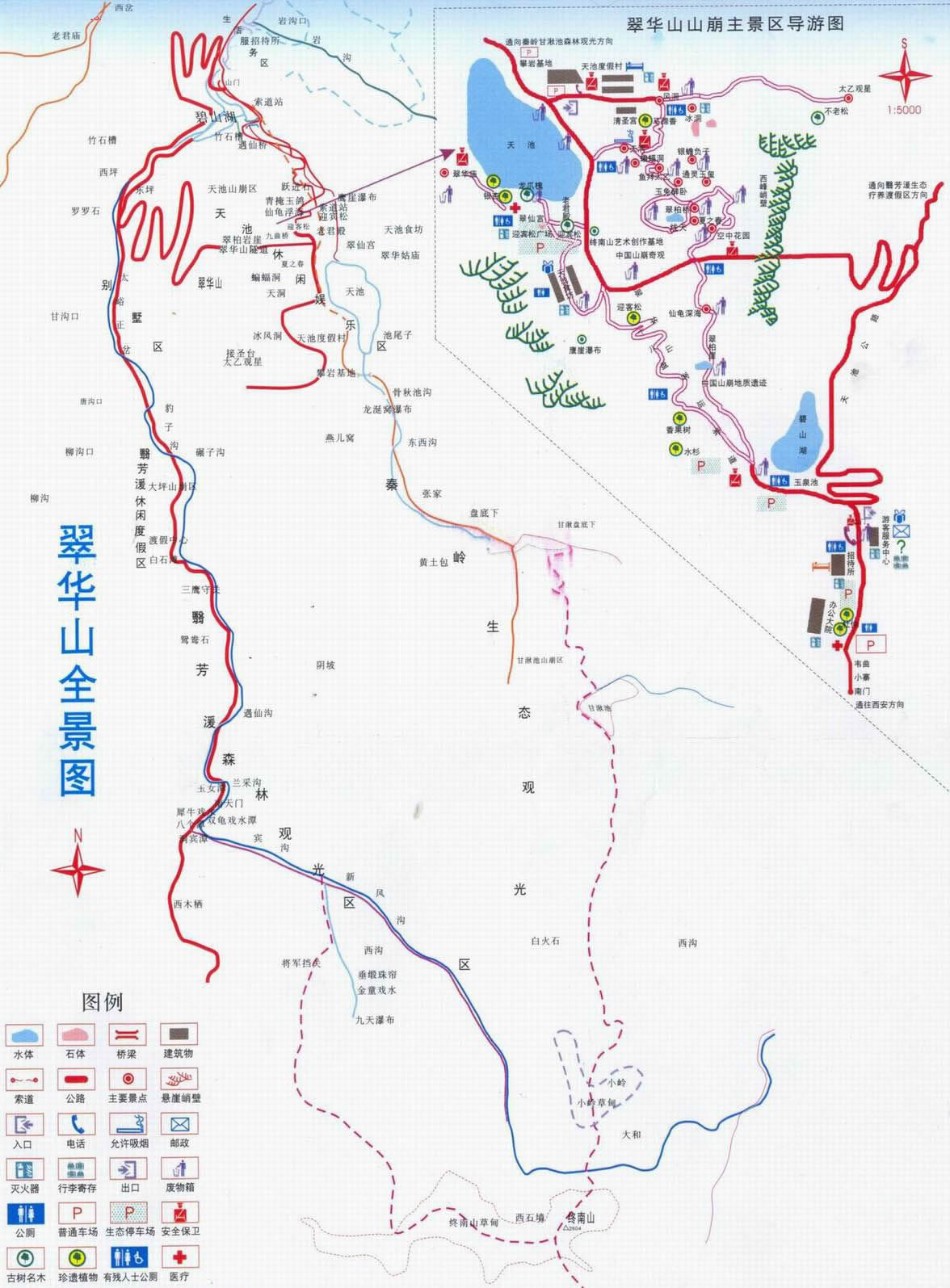 翠華山秀美的湖光山色和其國內(nèi)罕見的山崩地貌使翠華山以“終南獨(dú)秀”和“中國地質(zhì)地貌博物館”著稱。翠華山高峰環(huán)列,峭壁聳立,險(xiǎn)不可攀,中有一天然水池,稱“天池”,又稱“太乙池”或“龍移湫”,池水面積約5萬平方米。湫池群山環(huán)峙,碧波蕩漾,清明如鏡,纖塵不染。池南的太乙殿,是舊時(shí)遇旱祈雨之所。還有呂公洞、黃龍洞,池北的冰洞、風(fēng)洞、八仙洞等。冰洞在盛夏仍堅(jiān)冰垂凌,風(fēng)洞則四季寒風(fēng)颼颼。冰洞東南有飛流直下的瀑布。