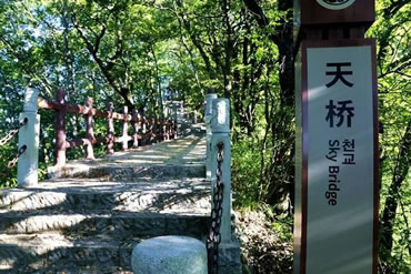云霧天橋是由泥土和山石天然堆砌生就而成的。它坐落在云霧山鬼谷嶺南麓一條山脊上,地處三天門到四天門之間。這里海拔近2000米,在天際的白云中飄浮,所以稱它為云霧天橋。此橋其實(shí)就是一條短短的山脊,長(zhǎng)約20余米,寬不足1米,僅容一人通過(guò)。