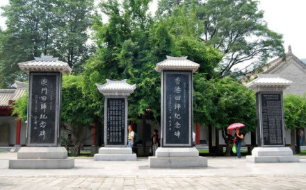 碑亭西前方,矗立著四塊石碑:香港回歸紀(jì)念碑、澳門回歸紀(jì)念碑、“臺灣光復(fù)致敬團(tuán)”祭黃帝陵文碑、慶祝香港回歸祖國十周年黃陵謁祖祭文碑。