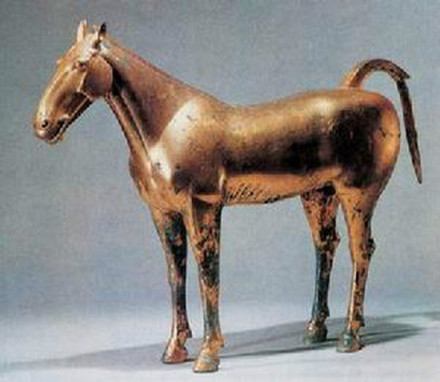 1981年5月在平陽公主墓南,西吳鄉(xiāng)竇馬村農(nóng)民在平整土地時發(fā)現(xiàn)這件文物。高62厘米,長76厘米,通體銅鑄鎏金,昂首,翹尾,四腿直立,體態(tài)矯健。頭部造型甚為生動,粉鼻亮眼,兩耳豎立。史書記載其為“金馬”,系以西漢時大宛國的汗血馬為原型而精制的工藝品。這件國寶,現(xiàn)收藏在茂陵博物館。