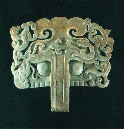 橫寬36.5厘米,灰綠色,下有凸鈕,四角略弧圓,分別碾琢其時流行的青龍、白虎、朱雀、玄武四神像。器物下方以環(huán)鈕為鼻梁,上連粗眉和暴起雙眼,形成大獸面,下緣則以8條豎紋勾勒出寬大的排牙。圖案化的形象莊嚴凝重,工藝精美,線條運用剛?cè)嵯酀?