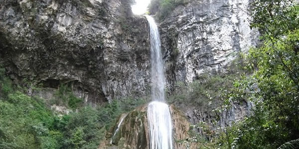 滴水巖,位于固軍鄉(xiāng)火石梁村東南。此地有一小溪為兩山所夾,越往上游山勢越高,坡度越陡。最終于小溪盡頭處兩山合為絕壁,其頂部成“V”字相交。相交處有一股清泉摔落至下方一堅立雞蛋狀的巨石,發(fā)出巨大的聲響。泉水再分為幾綹沿平滑如鏡的石壁滑落至下方深潭!遠遠看去,爬滿暗綠青苔的石壁上像是掛著無數(shù)條白色的絲帶和珠簾!雖景致與沙清河各有千秋,甚至略勝一籌。但因交通較為閉塞,所以知者不多,但來此觀光過的游客無不伸出大拇指一個勁兒地叫好!