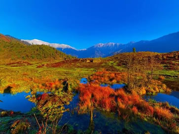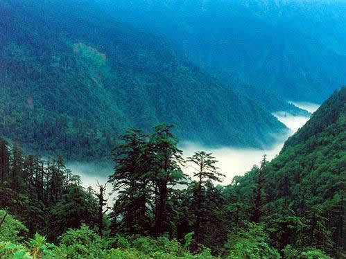 黑竹溝景區(qū)眾山群溝,60%是天然原始森林,25%是灌木叢林,15%屬高山草甸。森林公園內(nèi)自下而上出現(xiàn)常綠闊葉林帶(2000米以下)、針闊混交林帶(2000-2400米)、陰暗針葉林帶(2400-3600米)、高山灌叢的草甸帶(3600米以上)。常見(jiàn)闊葉樹(shù)種有大葉楠、香樟、木姜子、石櫟、絲栗、青岡、木荷等;落葉樹(shù)種有:槭樹(shù)、珙桐、連香、亮葉樺、紅樺、香樺、水青樹(shù)、楓楊、花楸等;針葉樹(shù)種有:鐵杉、云杉、冷杉、杜鵑花、箭竹等。