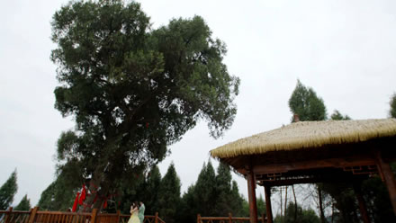 民間關(guān)于神仙樹的美麗傳說很多,相傳某年的八月八日,不知何方的一高一矮,一胖一瘦,一位仙風道骨,一位邋遢放浪的老者,飄然來到尖包嶺,點石為枰,碎石為棋,以石為凳,手談對弈。棋勢變幻之間,四周時而雷霆激蕩,時而風和日麗,時而萬物沉寂。這樣,不知過了多少時候,兩位老者抹掉棋枰,拂去棋子,背北面南,嘴里念念有詞,手里比比劃劃,頃刻間,尖包嶺大雨傾盆,繼而和風細雨,云蒸霞蔚,兩位老者飄然而去,所坐之地變成了五花石,形如花瓣的五花石中間長出兩棵高低錯落、枝繁葉茂的翠柏。從此,人們就把翠柏叫作“神仙樹”,把 “尖包嶺”叫作“神仙梁”。又有民間記載:仙海湖所在沉香鋪(現(xiàn)名沉抗鎮(zhèn))是民間傳說《寶蓮燈》中三圣母之子沉香生長和得道升仙的地方。據(jù)《廣異記》載:沉香大孝,其母被二郎神楊戩壓于華山之下,沉香以神、斧打敗二郎神,劈山救母,而神仙樹就是沉香仙子母子二人化身而來的兩株古樹,交織相連,撐天而起,屹立山巔,母子倆以深情目光,凝視著天下樹,庇護這天下蒼生。