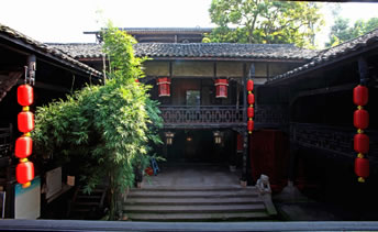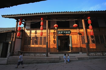 王朝聞故居(添壽堂)位于古鎮(zhèn)進士牌坊下側(cè),立木結(jié)構(gòu),是川南典型四合院,面積500平方米,院內(nèi)天井50平方米,有明代古井一口,一方戲樓,三方廂樓,木雕精美。故居分為戲樓、正堂、客廳、臥室、天井、作坊室、偏房等。正堂供奉神龕、神案,左右置太師椅。作坊室是王朝聞少年時代使用的碾子、龍骨車、風(fēng)簸、簸箕、撮箕、蓑衣、斗筐、鋤頭、犁耙等。