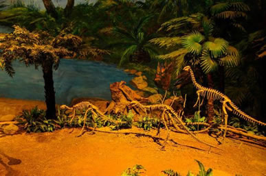自自貢恐龍博物館的現(xiàn)有基本陳列“侏羅紀恐龍世界”,按照“恐龍世界——恐龍遺址——恐龍時代的動植物——珍品廳——恐龍再現(xiàn)”順序展開,吸收現(xiàn)代陳列理念,采用場景式展示、擬人化組合,輔之以聲、光、電及多媒體等展示手段,展開了一幅蔚為壯觀、神奇瑰麗史前畫卷,再現(xiàn)了由恐龍及許多早已消失的物種構成的神秘多姿的侏羅紀時代。同時,還突出展示了博物館的精華—化石埋藏現(xiàn)場,給人以強烈的視覺沖擊和心靈震撼,充分體現(xiàn)了專業(yè)博物館與遺址博物館的雙重特色。