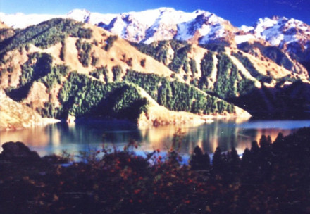 三江河洪水:即“南湖黃龍”,三江河水從大天池南段入湖處,由于博格達山區(qū)夏季降水較多,常暴雨盆潑,三工河上游集水面積有168平方公里,河水每當大雨洶涌北瀉,從天池北南望。