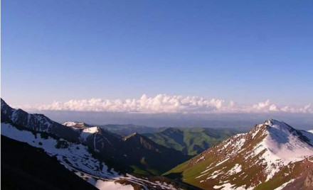 登山大營:在草甸草原自然景觀區(qū)和其上的高山礫漠自然景觀區(qū)的交接地帶,海拔為3540米,登博格達峰的大本營就設(shè)在這里。從天池南岸到大本營,登山者一般走下面兩條路:一是沿大東溝向東折南翻過“三個岔達坂”,這條路較為平緩;一是向南折東沿將軍溝翻過“以肯起達坂”,這條路則較為陡峭。兩條路的全程分別為25公里和30公里。