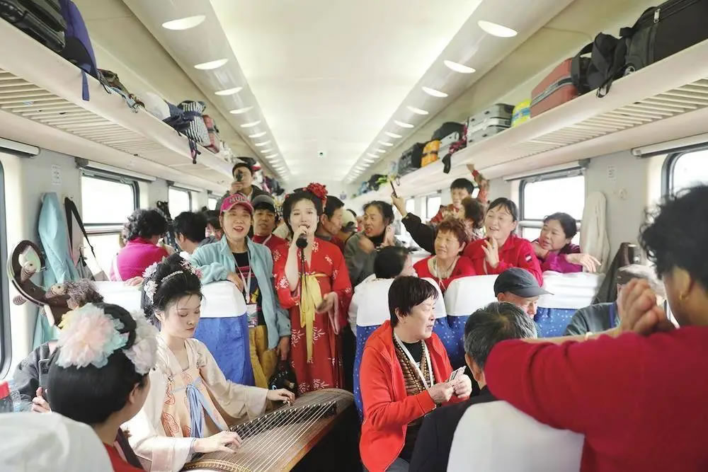 秋日的旅途被一系列精心策劃的活動(dòng)填滿。候車室內(nèi),老年旅客們拉起“環(huán)秦嶺賞秋之旅”的橫幅合影留念,臉上洋溢著笑容;列車上,悠揚(yáng)的古箏與清越的琵琶聲交織,唐風(fēng)歌曲緩緩流淌,瞬間讓車廂充滿雅致氛圍。身著古裝的特型演員帶來(lái)了驚喜互動(dòng),他風(fēng)度翩翩地與旅客們展開(kāi)詩(shī)詞對(duì)答。旅客們踴躍接句,答對(duì)的人還能獲得定制小禮品,車廂內(nèi)歡聲笑語(yǔ)不斷。