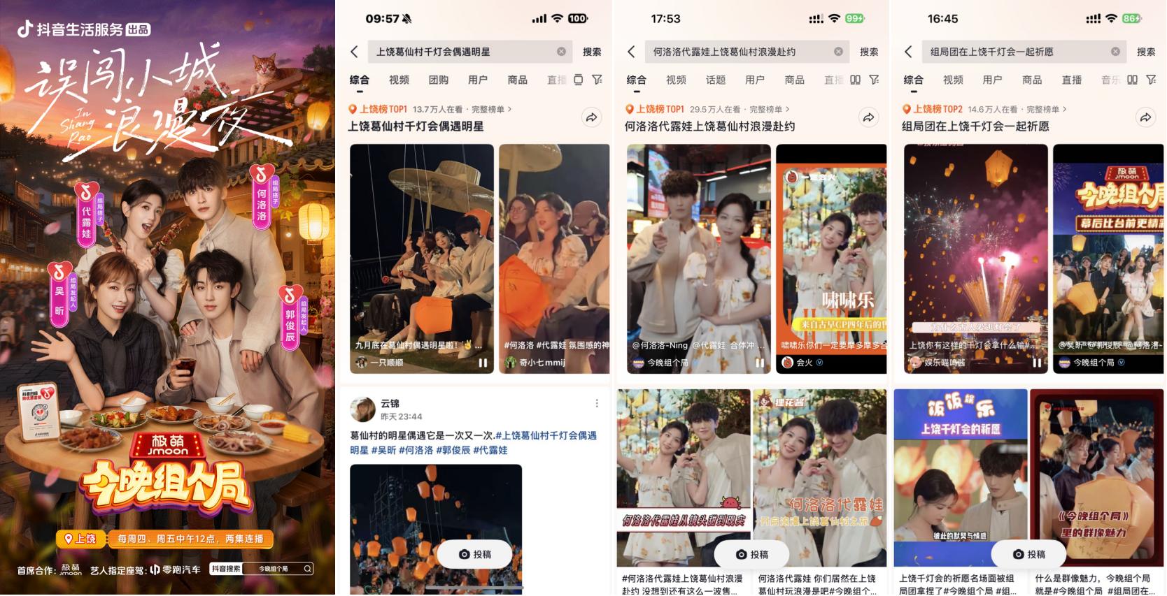 抖音牽手“秋日男友”魏哲鳴前往江西上饒葛仙村拍攝文旅宣發(fā)視頻引發(fā)廣泛關注,路透內容#在葛仙村偶遇魏哲鳴 登上上饒同城榜TOP1;主視頻發(fā)布后,#江西的秋日封神時刻 更登頂同城榜及全國種草榜TOP6;顒舆與綜藝《今晚組個局》實現(xiàn)聯(lián)動,吳昕、代露娃、郭俊辰、何洛洛等明星演員前往上饒拍攝定制化文旅內容,#上饒葛仙村千燈會偶遇明星 #何洛洛代露娃上饒葛仙村浪漫赴約 等路透內容與節(jié)目看點登頂上饒同城榜TOP1,#組局團在上饒千燈會一起祈愿 搶占同城榜TOP2。明星效應有效激發(fā)用戶出行意愿,葛仙村交易額同比403%顯著增長,持續(xù)引爆目的地&商家出圈。