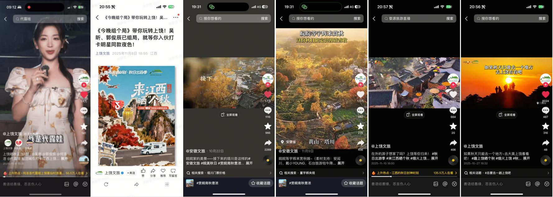 50余位跨界及垂類達人共同參與秋季種草內容創(chuàng)作,整體曝光量突破千萬級別,覆蓋江西上饒、安徽黃山15家重點頭部商家,以多元化的內容視角與持續(xù)的內容輸出,形成從點到面的內容爆發(fā)態(tài)勢,推動江西#婺源曬秋的味道藏不住了 、安徽#潛入徽州的秋日畫卷 等城市賞秋熱點上榜,讓江西與安徽兩地秋景,以更生動的方式呈現(xiàn)在用戶面前。
