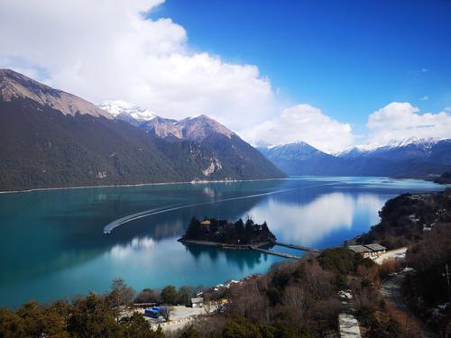 小島上有唐代的建筑“錯(cuò)宗工巴寺”,是西藏有名的紅教寧瑪派寺廟,建于唐代末年,距今已有1500多年的歷史了。錯(cuò)宗寺為土木結(jié)構(gòu),上下兩層,殿內(nèi)主供蓮花生、千手觀音和金童玉女。寺南有一株桃和松的連理樹,春天時(shí),桃花與青松相映,煞是好看。