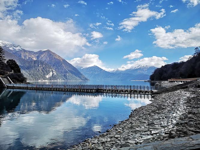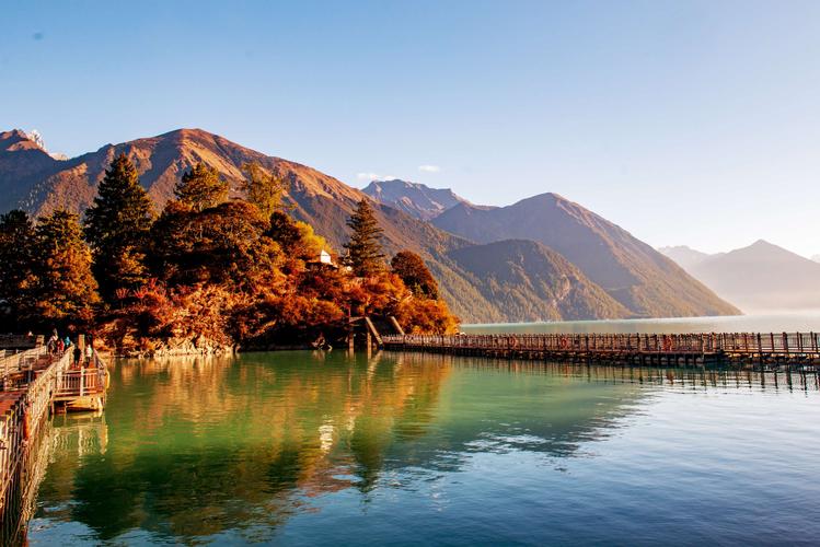 每到春季,湖四周群花爛漫,雪峰陣列并倒影湖中,景色宜人至極。秋季萬(wàn)山紅遍,層林盡染,天空碧藍(lán)如洗,火紅的楓葉折射燦爛的陽(yáng)光,倒影在碧藍(lán)的湖面,景色美不勝收。
