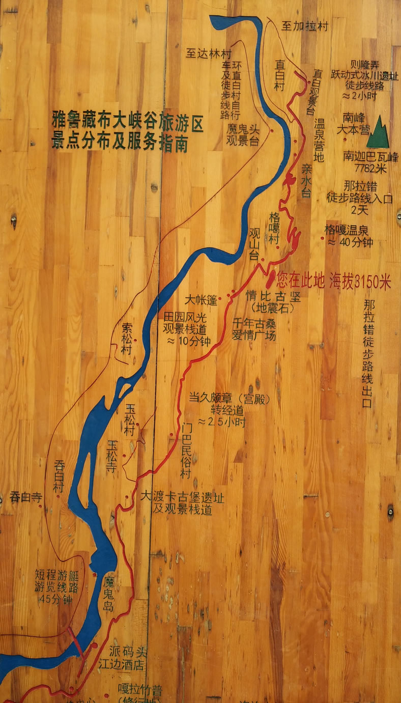 這個(gè)大峽谷北起米林縣派鎮(zhèn)的大渡卡村(海拔2880米)。南方可以看到南迦巴瓦峰和隔江對(duì)峙的加拉白壘峰。