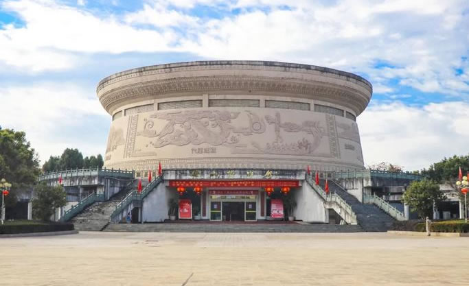 保山市博物館,位于保山中心城市文化中心(三館廣場)正中,占地8畝,坐南朝北。館舍為仿本地出土古代銅鼓造型,通高19.6米,最大直徑56.6米。是保山市重要的標(biāo)志性文化設(shè)施。建筑面積4500平方米,展廳面積3000平方米。