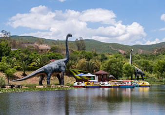 祿豐恐龍谷序館侏羅紀(jì)歷險(xiǎn)分水、陸兩條游路,游客或步行,或乘漂流筏穿越侏羅紀(jì)世界。祿豐恐龍谷序館侏羅紀(jì)歷險(xiǎn)區(qū)內(nèi)有“史前叢林”、“帝鱷河”、“恐龍部落”、“魚龍湖”等四大景觀,有“時(shí)空飛船”、“沼澤探險(xiǎn)”、“近親家園” “祿豐龍部落” “叢林幽靈”“魚龍?bào)@濤”等歷險(xiǎn)游樂項(xiàng)目。選擇步行的游客跟著恐龍腳印的引導(dǎo),進(jìn)入到沼澤地中,在恐龍的近親鱷魚和巨龜?shù)募覉@經(jīng)歷一段驚險(xiǎn)的旅程。選擇乘坐漂流筏的游客將沿河道順流而下,漂行在一片雨林之中,沿途將經(jīng)過友善的“祿豐龍部落”,避開叢林中相互追逐格斗的兇猛暴龍,但可能難以逃脫河道中突然出現(xiàn)的鱷魚群,和巨大的蛇頸龍掀起了撲面水浪。沿途藤蔓遮天的密林、枯樹橫倒的河灘、兩岸陡峭的峽谷、水草叢生的沼澤、巨石縱橫的跌水、開闊的疏林草地等景觀都透著遠(yuǎn)古的侏羅紀(jì)時(shí)代氣息,讓人感受更加真切。