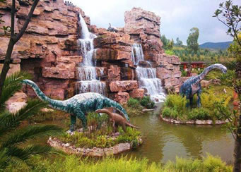 自然的山谷地貌,加上人工修筑的瀑布、河流、湖泊,和以大量的侏羅紀(jì)時(shí)期的植物景觀營造出翠綠的山谷、茂密的叢林、壁立的山崖、從山崖上跌宕而下的大瀑布,在潭邊和叢林里飲水覓食的恐龍、在沙丘邊沼澤地追逐爭斗的恐龍、高大的樹林里若隱若現(xiàn)的巨大梁龍。