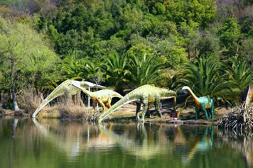 由“侏羅紀(jì)大瀑布”、“群龍對峙”、“腕龍相親”、“氣龍追逐”、“雙龍飲瀑”、“霸王龍窺獵”、“侏羅紀(jì)叢林”、“海棗之王”、“沙漠之林”等九大景觀真實(shí)再現(xiàn)了侏羅紀(jì)時(shí)代恐龍王國的生活場景,構(gòu)造出一個(gè)1億年前生氣勃勃、繁榮昌盛的侏羅紀(jì)世界,讓游客飽享一頓視覺大餐。