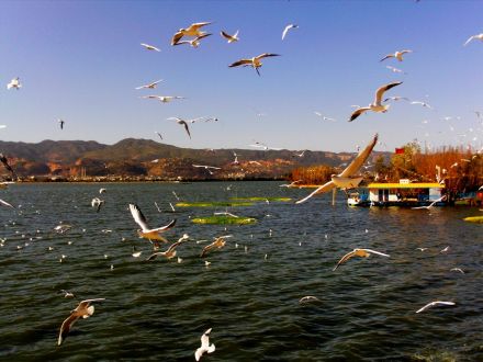 滇池位于昆明市南的西山腳下,其北端緊鄰昆明市大觀公園,南端至晉寧縣內,距市區(qū)5km,歷史上這里一直是度假觀光和避暑的勝地。滇池形似弦月,南北長39km,東西寬13.5km,平均寬度約8km。湖岸線長約200km;湖面面積300k㎡,居云南省首位,湖水最大深度8m,平均深度5m,蓄水量15.7億,素稱“五百里滇池”。是中國第六大內陸淡水湖。