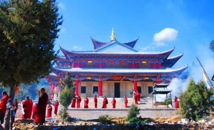 普濟(jì)寺位于麗江古城西北6千米的普濟(jì)山中,始建于清乾隆三十六年(1771年),為麗江城郊五大喇嘛寺之一,因大殿鋪蓋銅瓦面而聞名遐邇。大殿院落由山門、護(hù)法堂(門樓)、正殿、南北廂房組成四合院。正殿平面是長方形,初用土瓦覆蓋,由圣露活佛輾轉(zhuǎn)西南各地講經(jīng)、集資,于1936年改覆銅瓦,面積為46.4平方米。