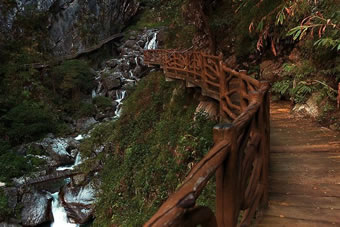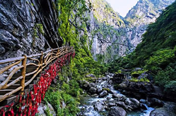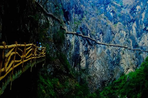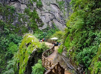 ②高空棧道探險游路:福緣橋——龍王廟——天開石門——鶴峰亭——五道水服務(wù)區(qū)——高空玻璃棧道——七彩玻璃觀景平臺——高空棧道——七道水彩虹橋——七道水瀑布——野生芭蕉林——百步天梯——萬獸谷——枯木要塞。全長3500米,