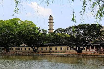 西塔始建于北宋開寶二年(969年),一說建于唐咸通十年(869年),明、清曾多次修繕。塔高32米,底徑7米,6邊形,7層,中空,系樓閣式青磚仿木構(gòu)建筑。遠遠望去,碧水藍天,全身披綠的西峰山托著磚紅色寶塔,塔剎直入云端,蔚為壯觀。就近處,江風吹動四十二個檐角的銅風鈴送聲,四周枝頭飛禽清脆的啼嗚,交響成趣。塔每層每面均有小佛龕,內(nèi)置石雕佛像,造型精致,神態(tài)自然,有頗高的藝術(shù)價值,塔周圍置青石坐凳,萬木扶疏。因塔身傾斜,曾于1982年進行大修葺。今塔仍保持宋代風格。