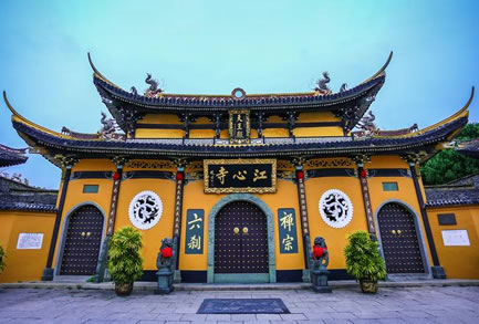 現(xiàn)存之江心寺為清乾隆五十四年(1789)重建,面積約2870平方米,分前、中、后三殿。前殿為天王殿,東西有長廊,兩端置鐘鼓樓。今宋代古鐘尚存。中殿為圓通殿,最為壯觀,供奉的是觀音菩薩,江心寺為全國32所觀音菩薩道場之一。殿內(nèi)檻聯(lián)匾額,琳瑯滿目。正柱聯(lián)為宋王安石撰并書。后殿三圣殿,殿額與對聯(lián)皆為弘一法師所書。寺院大門兩邊有題為宋王十朋撰書的疊字聯(lián):“云朝朝朝朝朝朝朝朝散,潮長長長長長長長長消”。由書法家方介堪正楷重寫。寺周古木參天,景色清幽。1983年列為全國對外開放142座重點寺院之一。