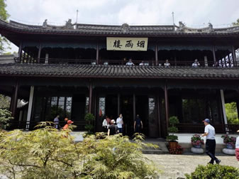 從東側(cè)園門進(jìn)入景區(qū),是一組古樸的清式建筑,這是根據(jù)金庸先生的《射雕英雄傳》中場(chǎng)景之一而建造的醉仙樓,樓中一副“江南七怪圖”活靈活現(xiàn),栩栩如生。2003年10月26日金庸先生在這里舉行八十大壽時(shí),揮毫題名“醉仙樓”,使這座建筑更添光彩。醉仙樓為餐飲樓,游客可在此一邊品嘗南湖船菜,一邊回味金大俠小說(shuō)中的武打場(chǎng)景。