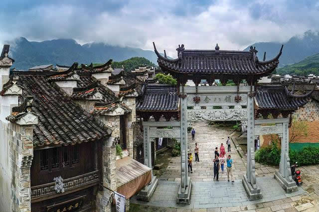 古鎮(zhèn)的大戶有曹、姜、楊、金四家。他們圍繞著宗族而居,至今還保留著36幢完整的古民居大院。站在老街上,最富有特色的是家家戶戶的門楣。門楣多為樓閣式,由梁、枋、檐、望板和垂簾虛柱構(gòu)成四柱三樓式。各個(gè)部件都有精細(xì)的木雕裝飾,題材多為福祿壽、合和二仙等吉祥物。這木制的門楣和江南其他地區(qū)的磚雕門樓有著截然的反差,使人走在這老街之上,無(wú)不被這景色所吸引?催@徽式的馬頭墻、浙式的屋脊、贛式的檐櫞、閩式的土墻,其內(nèi)涵的豐富已足以使建筑學(xué)家所驚嘆。