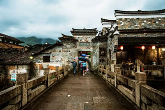 廿八都鎮(zhèn)的建筑依古道兩側(cè)而建,長(zhǎng)達(dá)1公里。北為洵里街,以住宅為主;南為楓溪街,以經(jīng)商為主。古鎮(zhèn)在清同治年為鼎盛期,光飯鋪酒店就50多家,南北雜貨批發(fā)商有40多家。然而更讓人注目的則是這里的橋、廟、閣等公共建筑。水安橋,一座廊橋橫架于楓溪之上,在晨霧的繚繞和夕陽(yáng)的照耀下,展現(xiàn)出不同的側(cè)面,著實(shí)謀殺了我們不少膠卷。勞作了一天的人們和嬉戲倦了的孩童在廊橋休憩,又為這美景增色幾分。楓溪橋是典型的石拱橋構(gòu)造,它與周邊的水星廟構(gòu)成了一副恬淡而抒情的中國(guó)畫。其余的如花橋之類的只空留地名而已,原橋的構(gòu)造不復(fù)存在了。