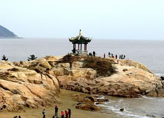 南天門地處普陀山南的南山上,與短姑道頭對峙。南天門孤懸入海,處于普陀山最南端,與該島一水相隔,架有石橋,橋身似龍,名環(huán)龍橋。此地巨石森立,危巖高聳,中有兩石如門,故名南天門。闕門飛檐起角,中間書有“南天門”三字,旁有龍眼井,崖上有石鼓,闕左上方有獅子石。南天門內群巖聳秀,門前碧波浩渺,摩崖石刻眾多,門側有清康熙年間(1662年—1722年)武將藍理所題“山海大觀”四字。門里有梵宇琳宮,宇旁有一巨巖,可緣石級而登臨巖頂。巖頂平坦,有兩處小水潭,潭水清淳發(fā)光,俗稱獅子眼,巖石上鍥有“龍華大會”、“砥柱南天”、“海岸孤絕處”等石刻。傳說這里是八仙過海的地方,普陀山禪宗始祖真歇禪師曾結茅于此。