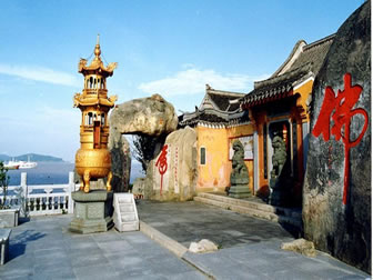 慧濟寺,亦稱佛頂山寺,又名“后寺”,普陀山三大寺之一。明初僧慧圓結茅山頂,創(chuàng)立慧濟庵。清乾隆五十八年(1793)擴庵為寺,名慧濟寺。全寺有四殿、七宮、六樓,與普濟、法雨并稱為普陀三大寺。