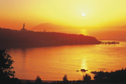 南海觀音立像位于普陀山風景名勝區(qū)之東南的龍灣崗巔。這一尊南海觀音立像總高33米,其中臺基高13米,銅像高18米,蓮花座為2米,重70多噸。佛像基層是面積1000多平方的功德廳,上層供奉500尊形態(tài)各異的觀音銅像,下層大廳飾有觀音靈異故事的大型黃楊木雕和以普陀山風景名勝區(qū)景色為題材的彩玉浮雕。