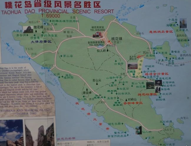 桃花島與——普陀山、“沙雕故鄉(xiāng)”——朱家尖、“十里漁港” ——沈家門組成普陀旅游金三角。 桃花島歷史悠久,宋乾道《四明國(guó)志》有證:客浦遺址考證,在商國(guó)時(shí)期就有人類活動(dòng)的足跡。先秦,隱士安期生漂流至桃花島,采藥修道,開爐煉丹。嘗以醉墨灑于山石,遂呈桃花紋,奇形異狀,宛若天然,故石稱桃花石,山稱桃花山,島稱桃花島,被譽(yù)為“海上仙山”。桃花島擁有舟山千島第一高峰——安期峰,海拔539.7米;舟山第一深港——桃花港;東南沿海第一大石——大佛巖,巖體高 78米;舟山第二大沙灘——千步金沙;還是中國(guó)三大水仙名品之一的普陀水仙和浙江名茶之一的普陀佛茶的主要產(chǎn)地;又是浙江沿海島嶼中林木品種最多的島嶼,共有78科、556種,素有“海島植物園”之美譽(yù)。桃花島碧海金沙環(huán)繞、多奇峰怪石、林木蔥郁、氣候宜人、環(huán)境清幽、風(fēng)光旖旎,集山、海、沙、石、礁、巖、洞、花、林、鳥、寺、廟、庵、天象奇觀、軍事遺跡、歷史紀(jì)念地、摩崖石刻、神話傳說于一體,自然景觀與人文景觀相映成輝,相得益彰。大佛巖是桃花島的標(biāo)志,不但自然景觀獨(dú)特,而且蘊(yùn)含著豐富的武俠文化內(nèi)涵,是金庸筆下《射》書中桃花島主黃藥師的主要活動(dòng)場(chǎng)所。大佛巖中腹的“清音洞”是先秦安期生漂流到桃花島后的第一個(gè)居室,在《射》書中是黃藥師藏《九陰真經(jīng)》和關(guān)押老頑童周伯通的石窟。安期峰以峰、石為特色,寺、洞為主體,龍、道、佛三大文化為背景,具有山清、水曲、石趣、峰奇、境幽、氣爽的特點(diǎn)。安期峰是舟山群島獨(dú)一無(wú)二的風(fēng)景,古代詩(shī)人在此留下了不少名句。安期生選此仙境長(zhǎng)時(shí)期在此隱居,學(xué)道煉丹,直至白發(fā)蒼蒼,人稱“千歲翁”,為后人留下了寶貴的文化遺產(chǎn)。位于桃花島東海岸的桃花峪,奇巖壁立,桃花峪龍珠灘上,有一顆直徑80厘米,重約500公斤的球形石被人們稱為“東海神珠”。每當(dāng)臺(tái)風(fēng)將臨時(shí),海浪激飛散落,形成七彩長(zhǎng)虹似龍騰躍,龍珠在龍喉里吞吐翻滾,發(fā)出隆隆回音,編織出一幅美妙神奇的“金龍吐珠”圖,被譽(yù)為“中華一絕”。形如拇指從掌中彈出,孤峰矗立、刀削斧劈、懸崖絕壁的彈指峰,是桃花龍女恩賜給桃花島鎮(zhèn)海擋風(fēng)的玉如意,也是金庸筆下桃花島主黃藥師練功習(xí)武之所。這里的海崖風(fēng)光可謂佳境。難怪600多年前元朝文學(xué)家吳萊到此游玩時(shí)寫詩(shī)贊曰:“……雕鎪鬼斧觖,刮濯龍湫移……”清代文學(xué)家朱緒來桃花島泛舟環(huán)游,寫下了《桃花山》和《桃花龍?zhí)丁吩?shī),贊美桃花島風(fēng)光。在《桃花山》詩(shī)中還特別點(diǎn)出了觀環(huán)島景觀的感受,詩(shī)曰:“墨痕乘醉灑桃花,石上斑紋爛若霞。浪說武陵春色好,不曾來此泛仙槎。”桃花島不但具有濃郁的漁鄉(xiāng)風(fēng)情和民俗文化,而且各代不少文人墨客、旅行家來桃花島觀光、探奇、尋古、考證,從先秦的安期生第一個(gè)上島之后,漢時(shí)的大臣李少純;宋時(shí)的文學(xué)家蘇軾;元朝文學(xué)家詩(shī)人吳萊;明朝的文學(xué)家、軍事家朱丸;清朝文學(xué)家、詩(shī)人朱緒、繆燧;直到當(dāng)代武俠文學(xué)大師金庸,每一位名人都留下了與實(shí)景相結(jié)合的作品。
