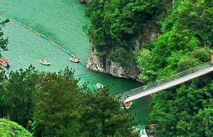 過龍?zhí),潭水平和,為峽谷漂流的登筏之處;懸空橋由鋼索懸架而成,長近70米,高逾40米,上橋行走,凌空晃蕩,不少游客會為之發(fā)怵心顫,給人以無窮刺激,有人稱之為“勇敢者橋”。五星橋頭設(shè)有山貨市場,可供應(yīng)大峽谷內(nèi)的各種特產(chǎn)。